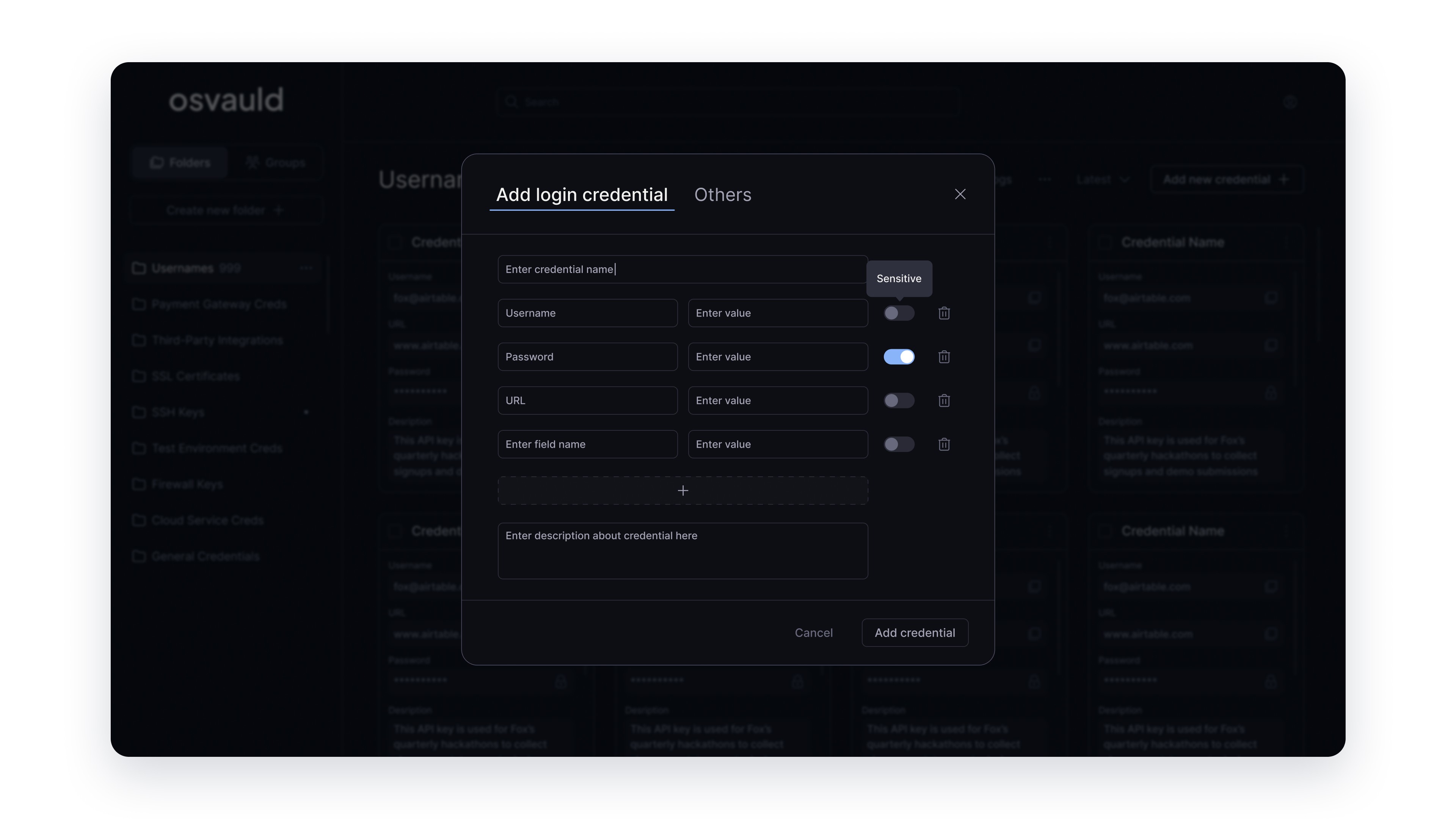 Created a “no‑brainer” add‑credential modal that switches between login/API/secret types with sensitive‑field toggles to avoid accidental exposure