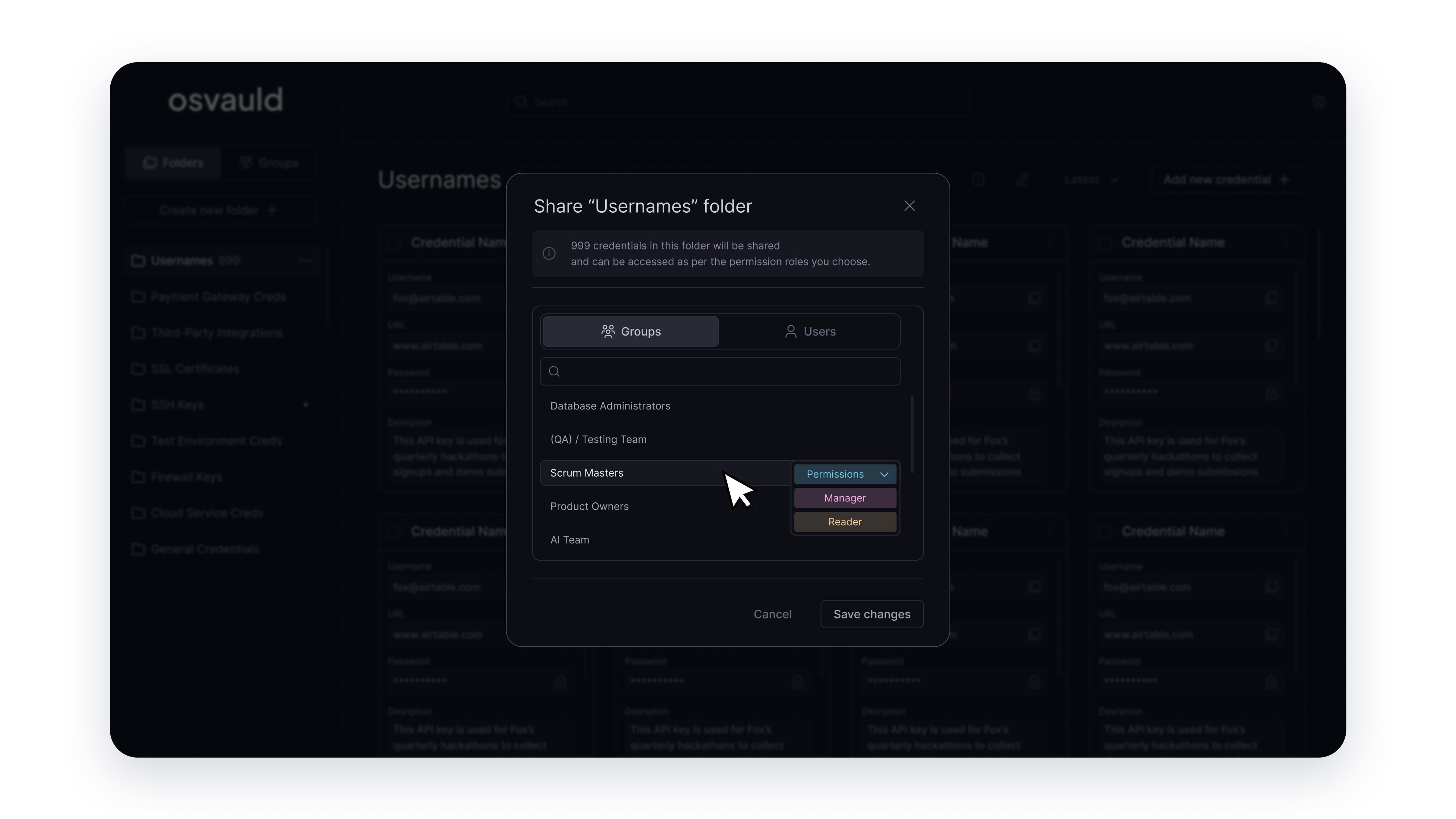Folders of secrets can be shared with specific users or groups using predefined role‑based permissions, enabling least‑privilege access without operational friction.